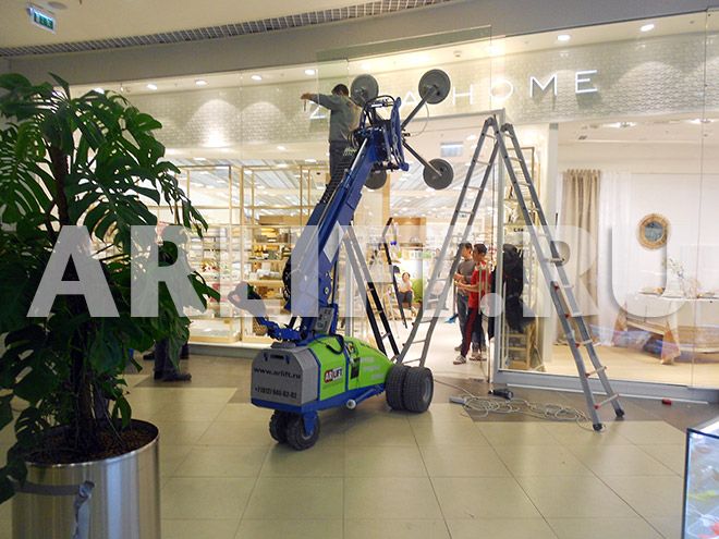 Монтажная компания взяла в аренду стеклоробот Winlet 575 для остекления витрин. Витражные стекла были установлены быстро и надежно, а у монтажников осталось море положительных эмоций от использования чудо-робота Winlet.