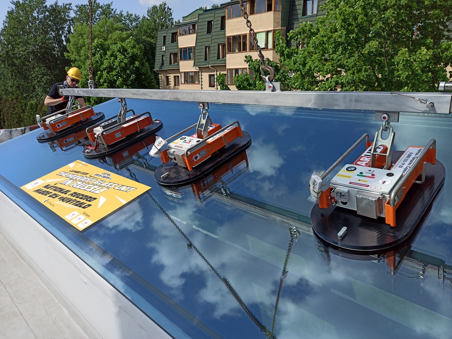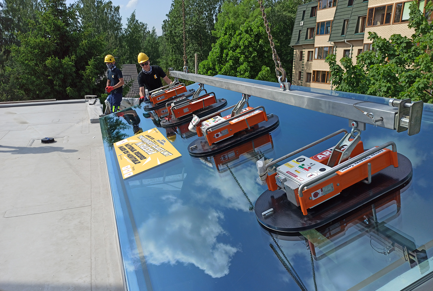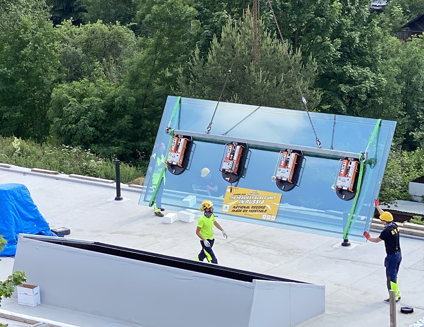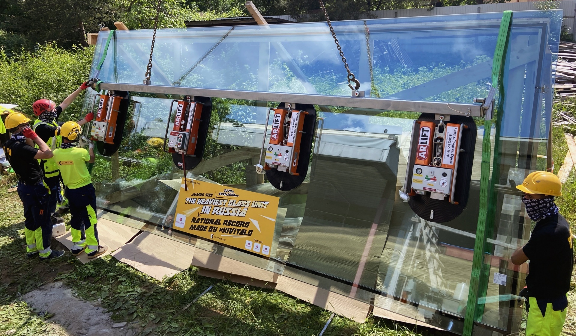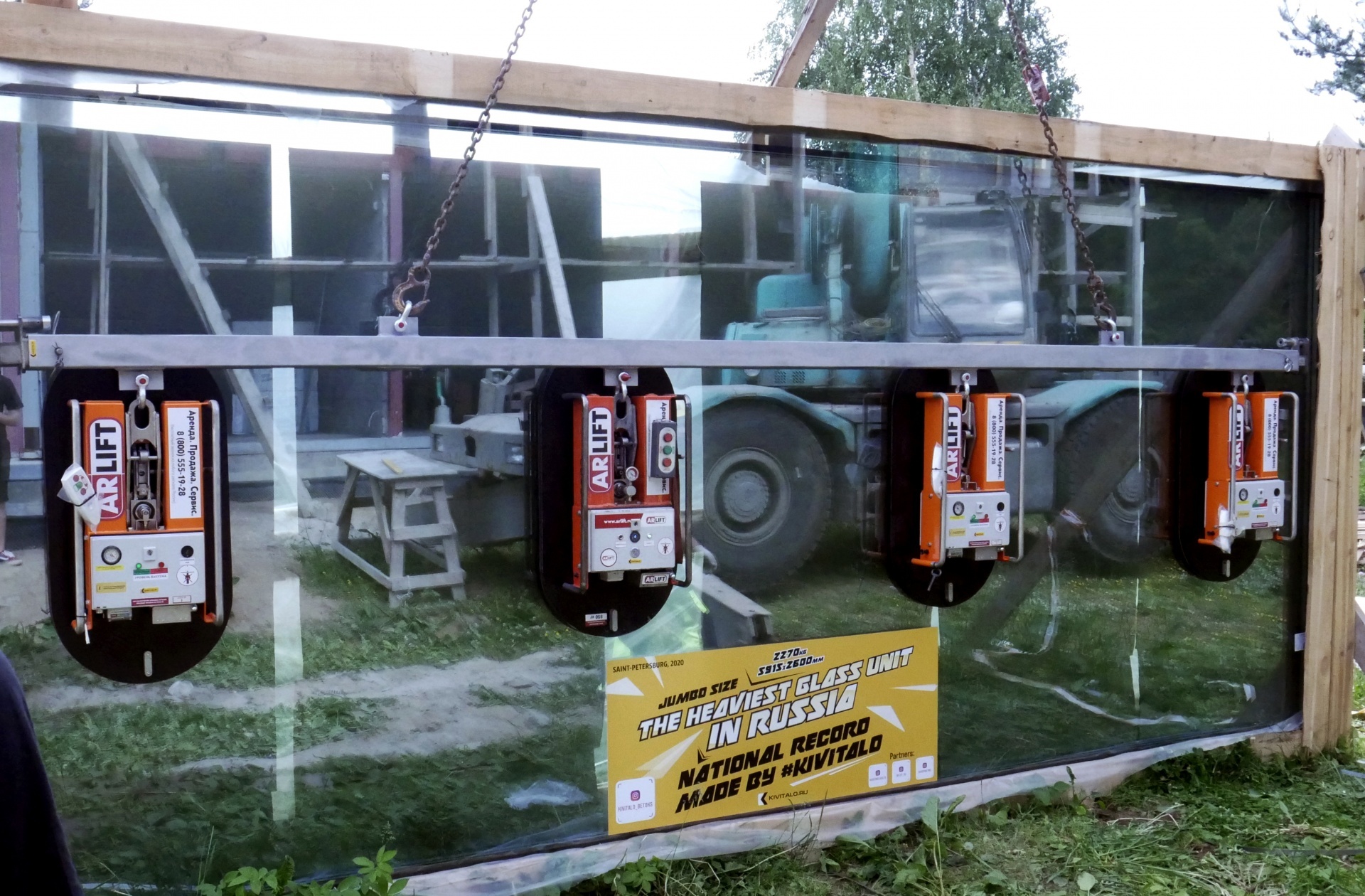 Для установки стеклопакета весом 2270 кг и размером 6 метров на 2,5 метра специалистами компании Арлифт была разработана и произведена уникальная траверса, которая позволила одновременно использовать 4 вакуумных захвата линейки GS с грузоподъёмностью до 850 кг. Монтаж производила строительная компания Kivitalo, специализирующаяся на проектировании и строительстве финских каменных домов в Санкт-Петербурге и Москве.