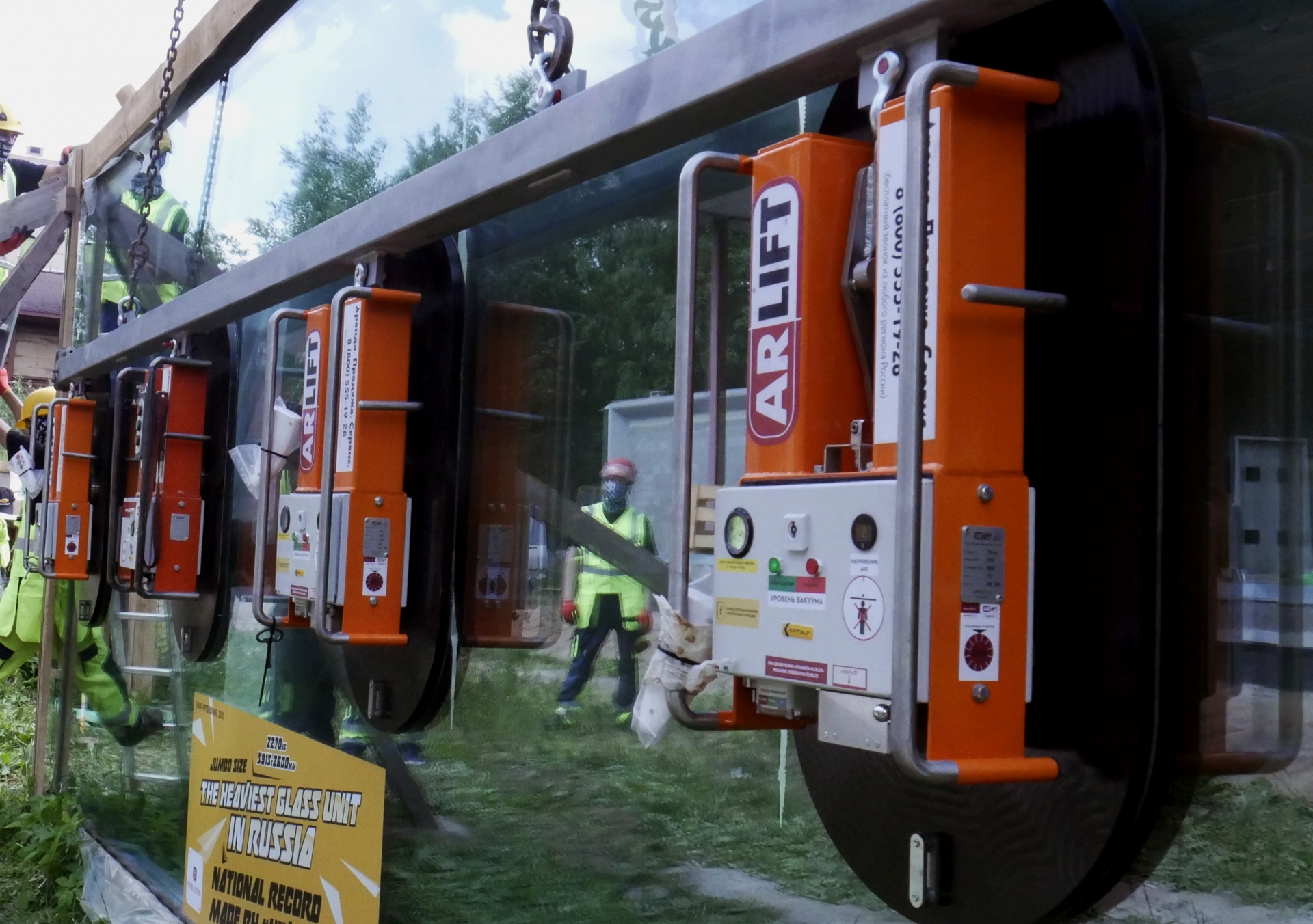 Есть заявки на новый рекорд?! Технический отдел компании Арлифт может в индивидуальном порядке разработать и произвести для вас работающее решение по монтажу стекла и сэндвич-панелей любых размеров.