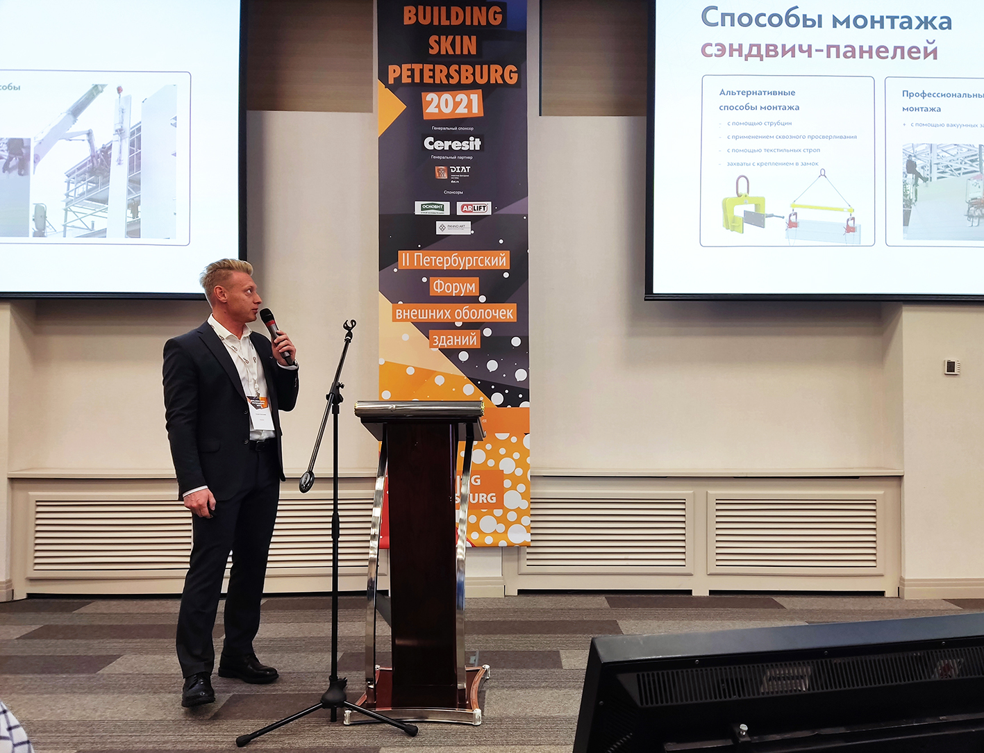 Помимо этого, на форуме выступил исполнительный директор компании Арлифт, Александр Урушев, осветив современные способы монтажа фасадов, а также особенности нового ГОСТ по монтажу стекла и сэндвич-панелей с использованием вакуумных захватов, который вступил в силу в конце 2020 года.