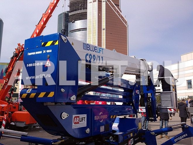 Особый интерес вызвала компактность вышки, которая при вылете стрелы 22 метра имеет минимальную площадь стабилизации аутригеров 1984 х 5671 мм, способна проехать в одностворчатую дверь и произвести работы как снаружи, так и внутри помещения.