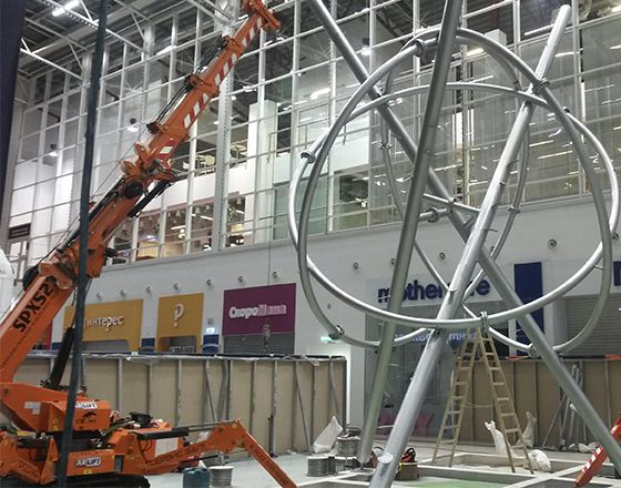 В задачи специалистов АРЛИФТ входила сборка, подъем и монтаж металлического шара. Для выполнения задач были применены два мини-крана JEKKO SPX527CDH.