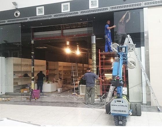 В Краснодаре стеклороботами Winlet производился монтаж витрин магазина в МЕГА Краснодар. Стеклоробот без труда и в максимально короткие сроки смонтировал длинные стекла размером 1 х 4 м.