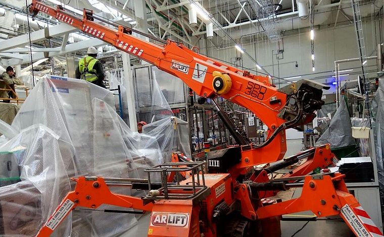 Благодаря электромотору и резиновым гусеницам мини-краном удалось выполнить монтаж металлоконструкций в «чистом» помещении, наполненным аппаратами для производства, не задев оборудования и не нанеся вреда выхлопными газами.
