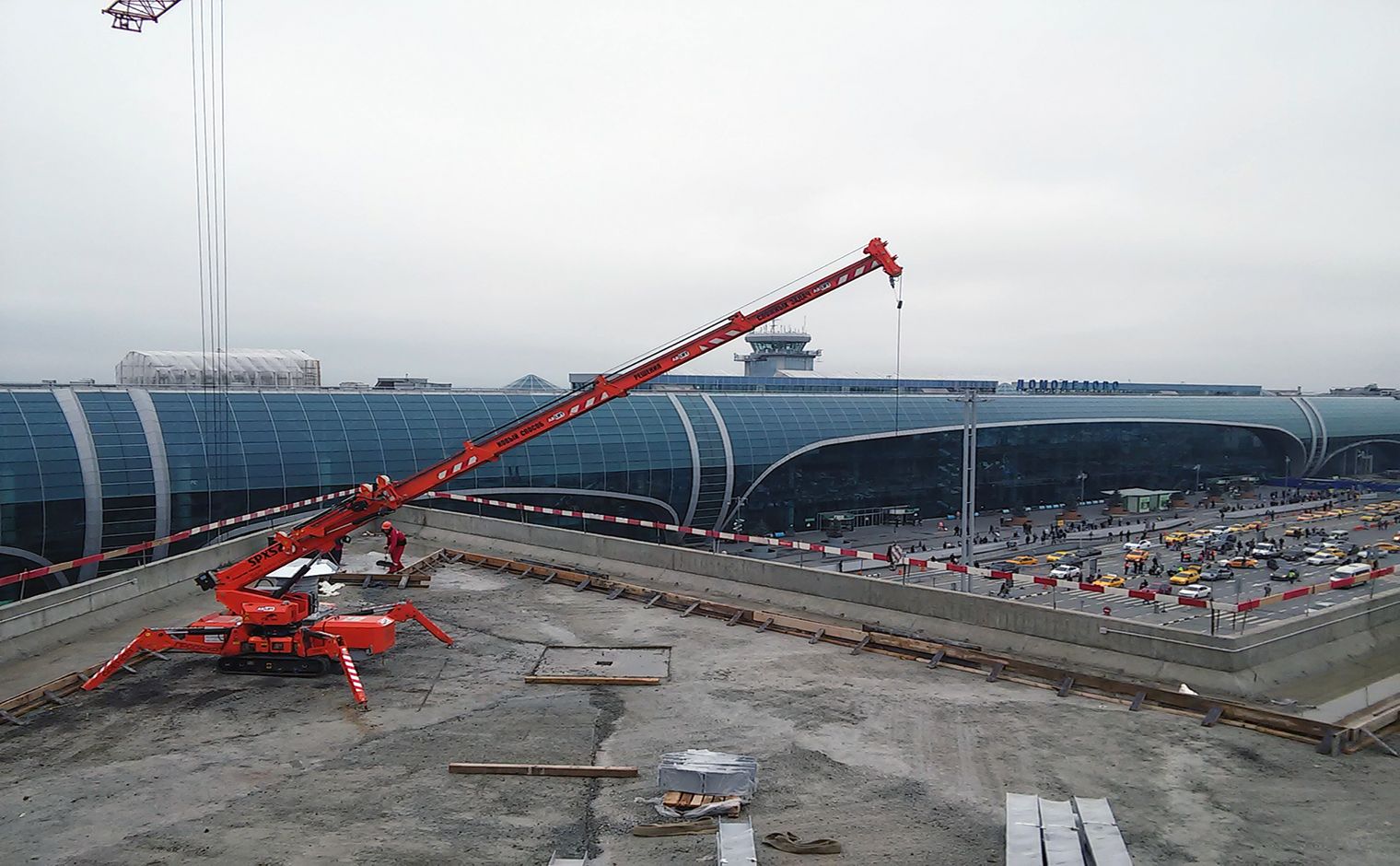 Мини-кран прекрасно справился с работой по монтажу металлоконструкций на крытой многоуровневой парковке в аэропорту Домодедово благодаря своей компактности, манёвренности и быстрому выполнению работ.
