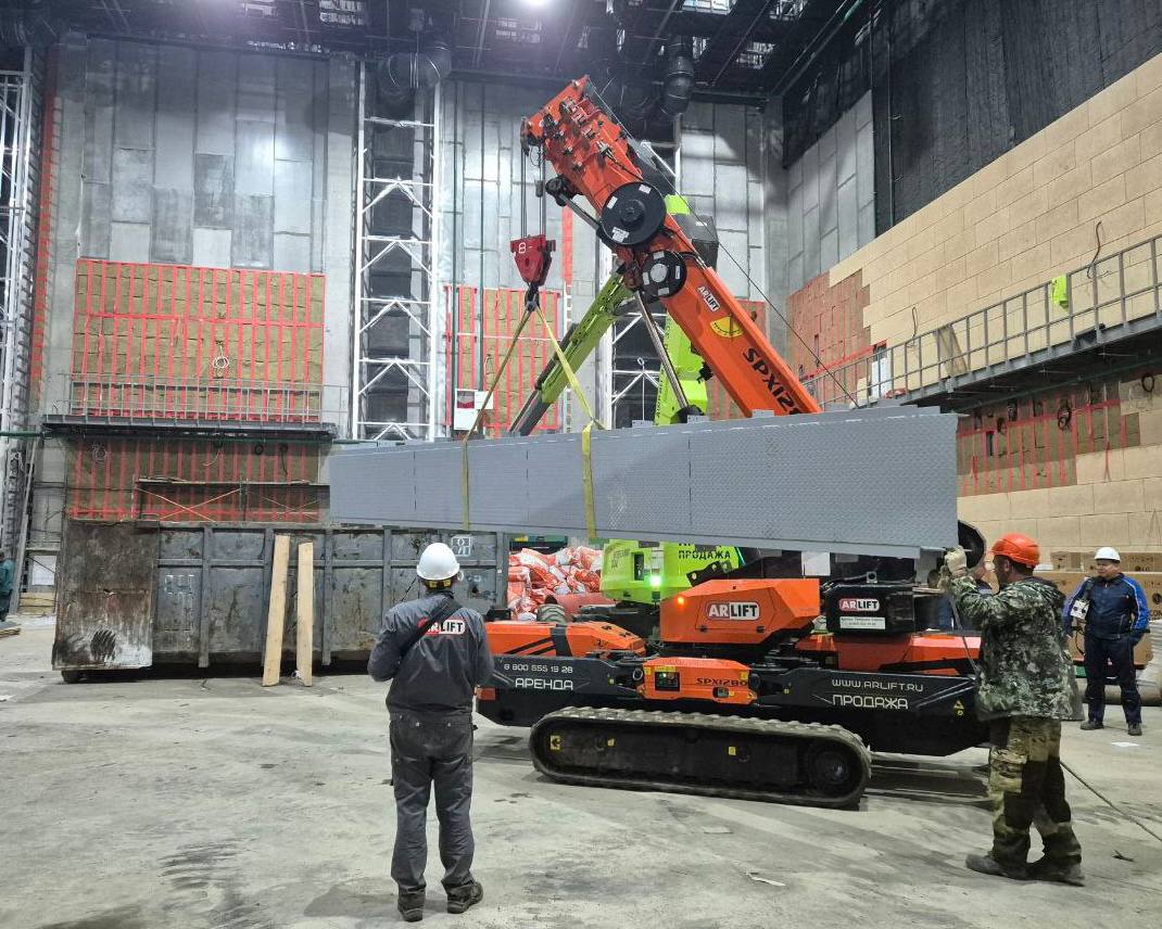 Мы предложили неожиданное решение: работать без погрузчика в паре с краном. И применили мини-кран SPX 1280 с функцией Pick&Carry. Такая технология позволяет работать технике и как обычный кран (в режиме на опорах), и как погрузчик.