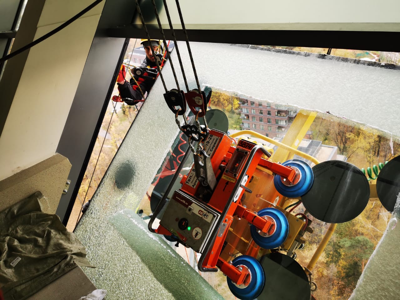 Для установки стеклопакетов был выбран вакуумный захват собственного производства компании Арлифт, Arlifter GS-500 и радиальный комплект F/R 450. Выбор в пользу этого оборудования был сделан не случайно. Несмотря на то, что глазу практически не виден изгиб стекла, он все же имеет место быть.