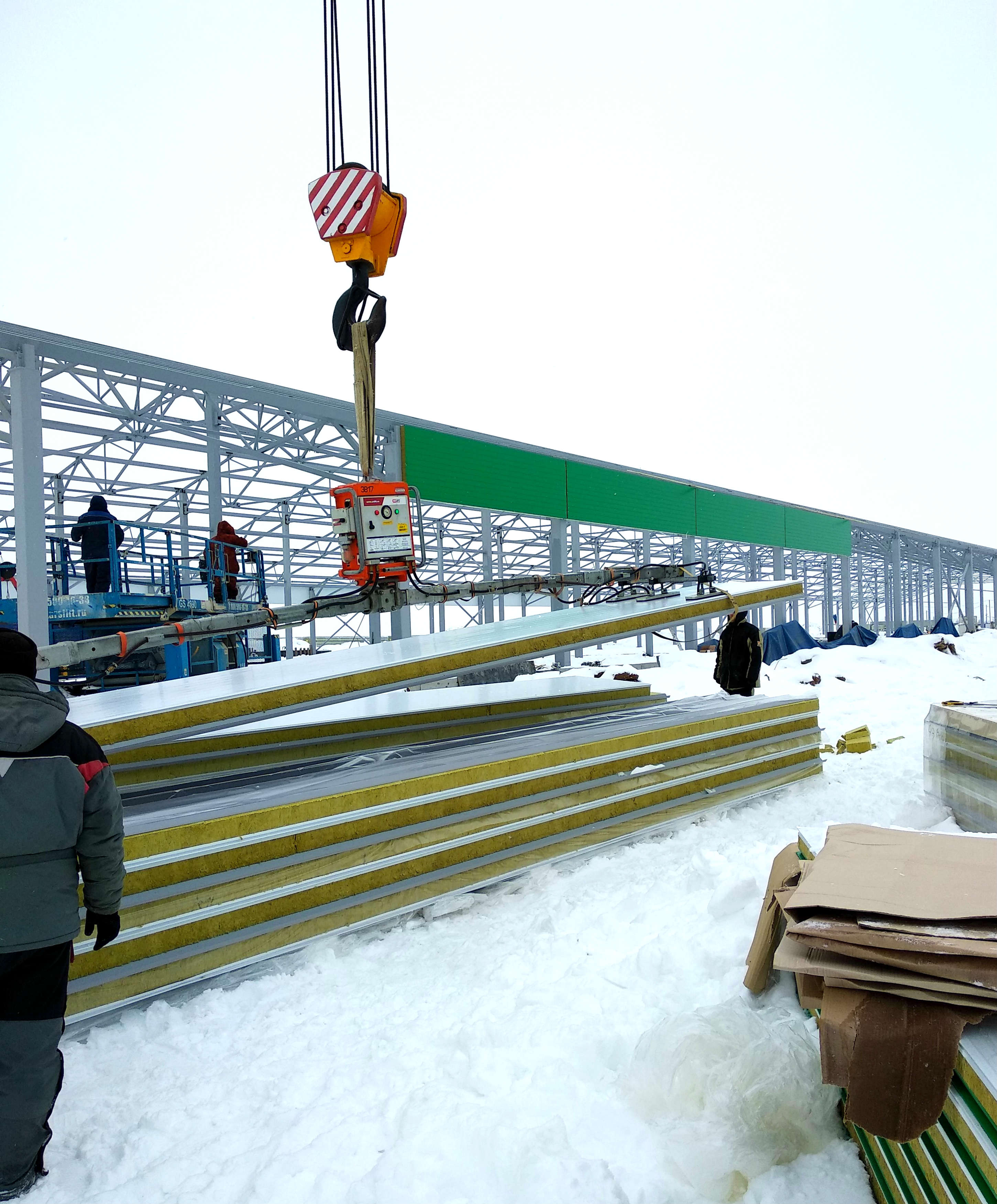 Вакуумный захват ARLIFTER SP-4 произвел монтаж кровельных сэндвич-панелей общим объемом 6 000 кв. метров. Длина каждой панели — 12 метров. Главная сложность заключалась в том, что монтаж нужно было производить под углом. Но наше оборудование без труда справилось и с такой задачей.