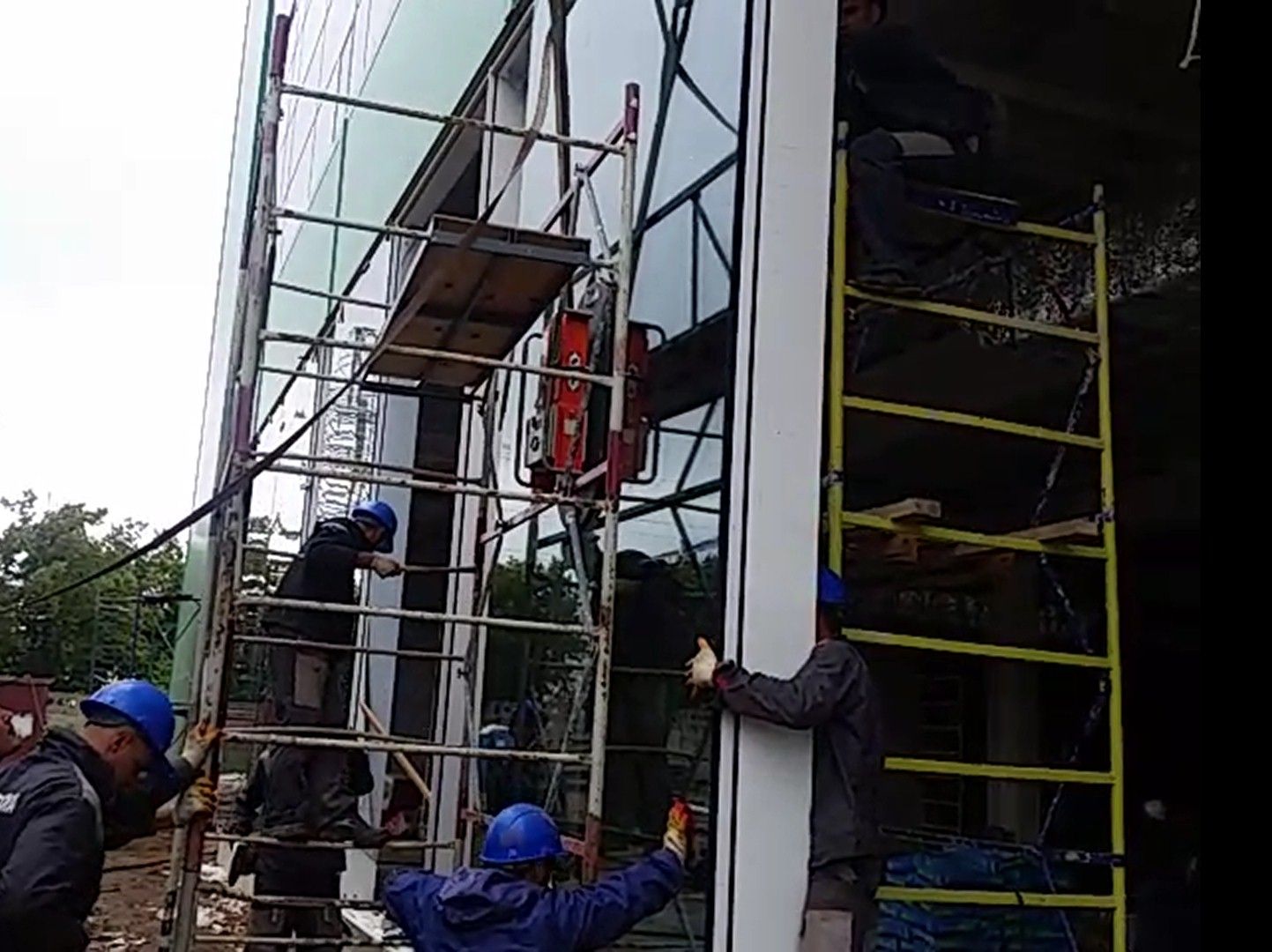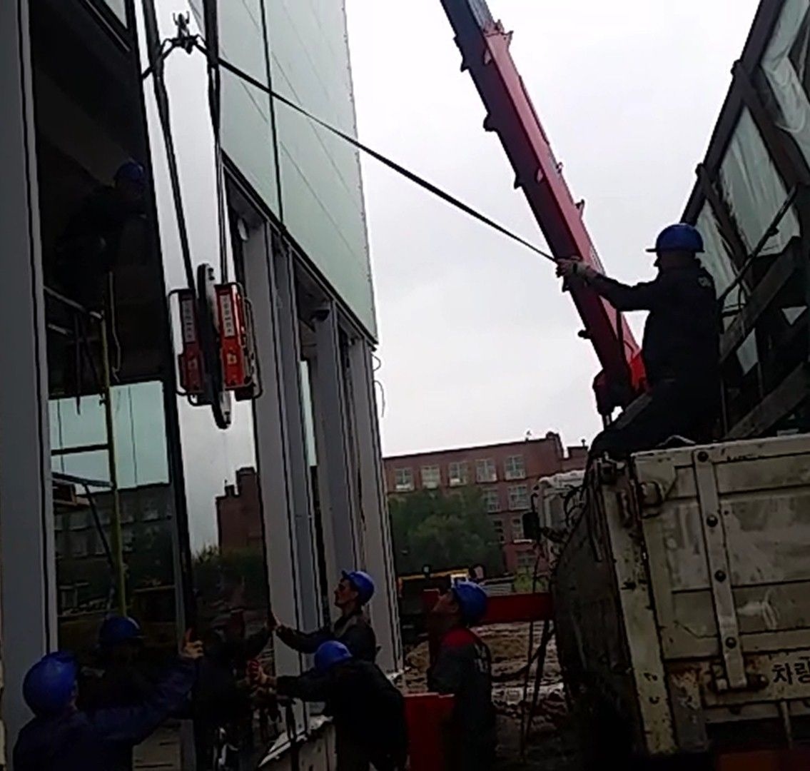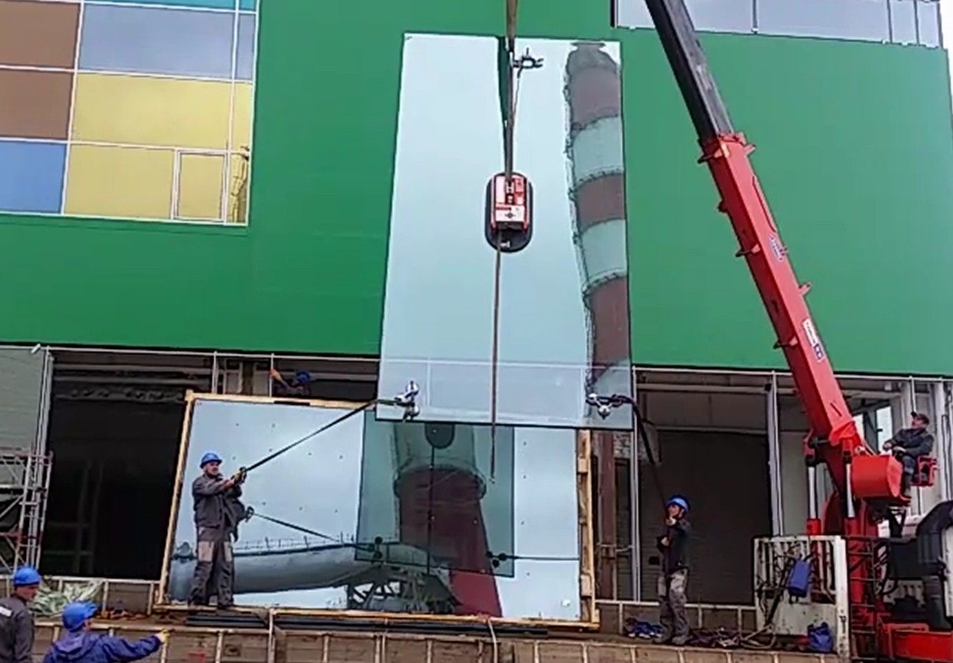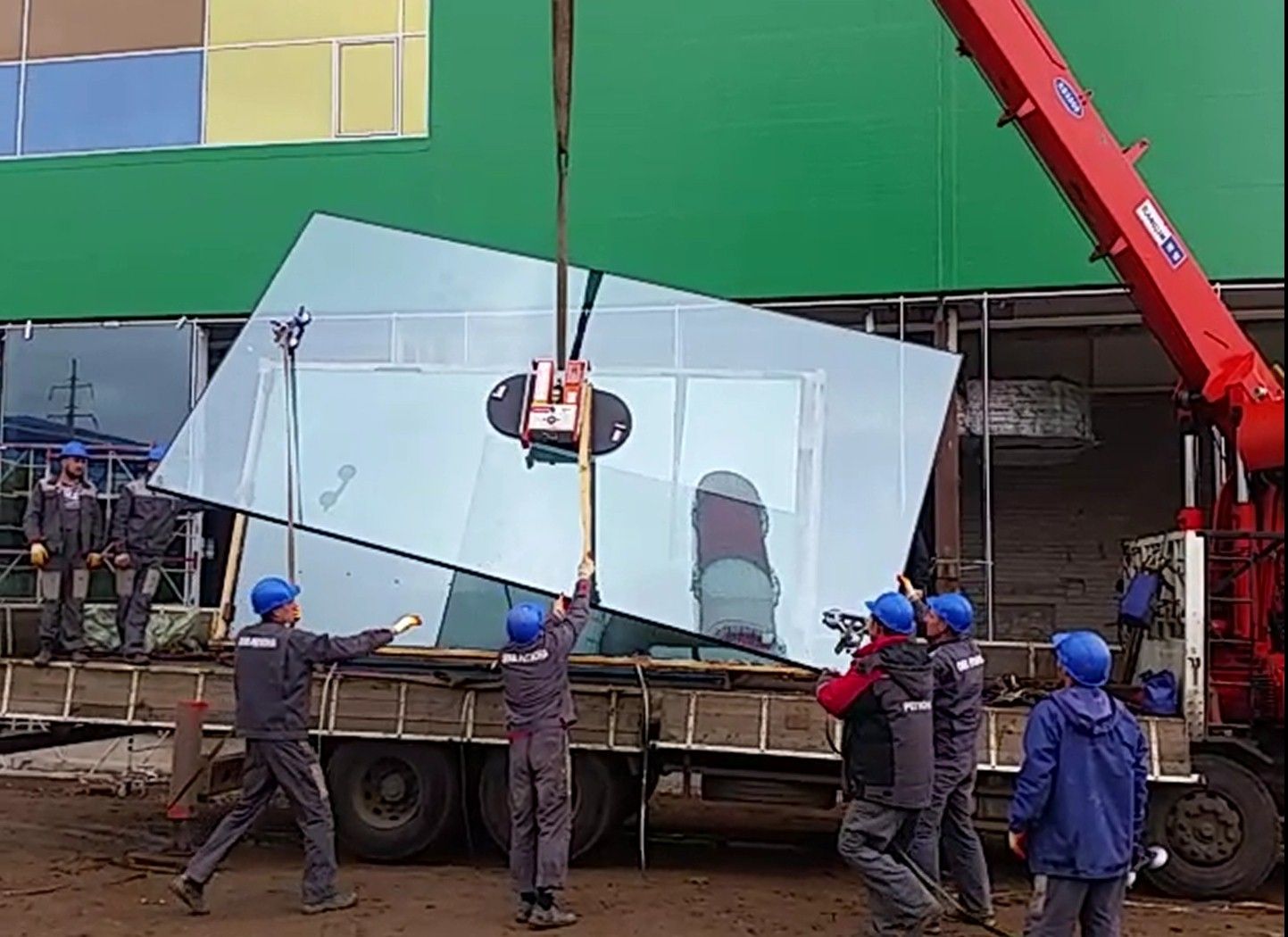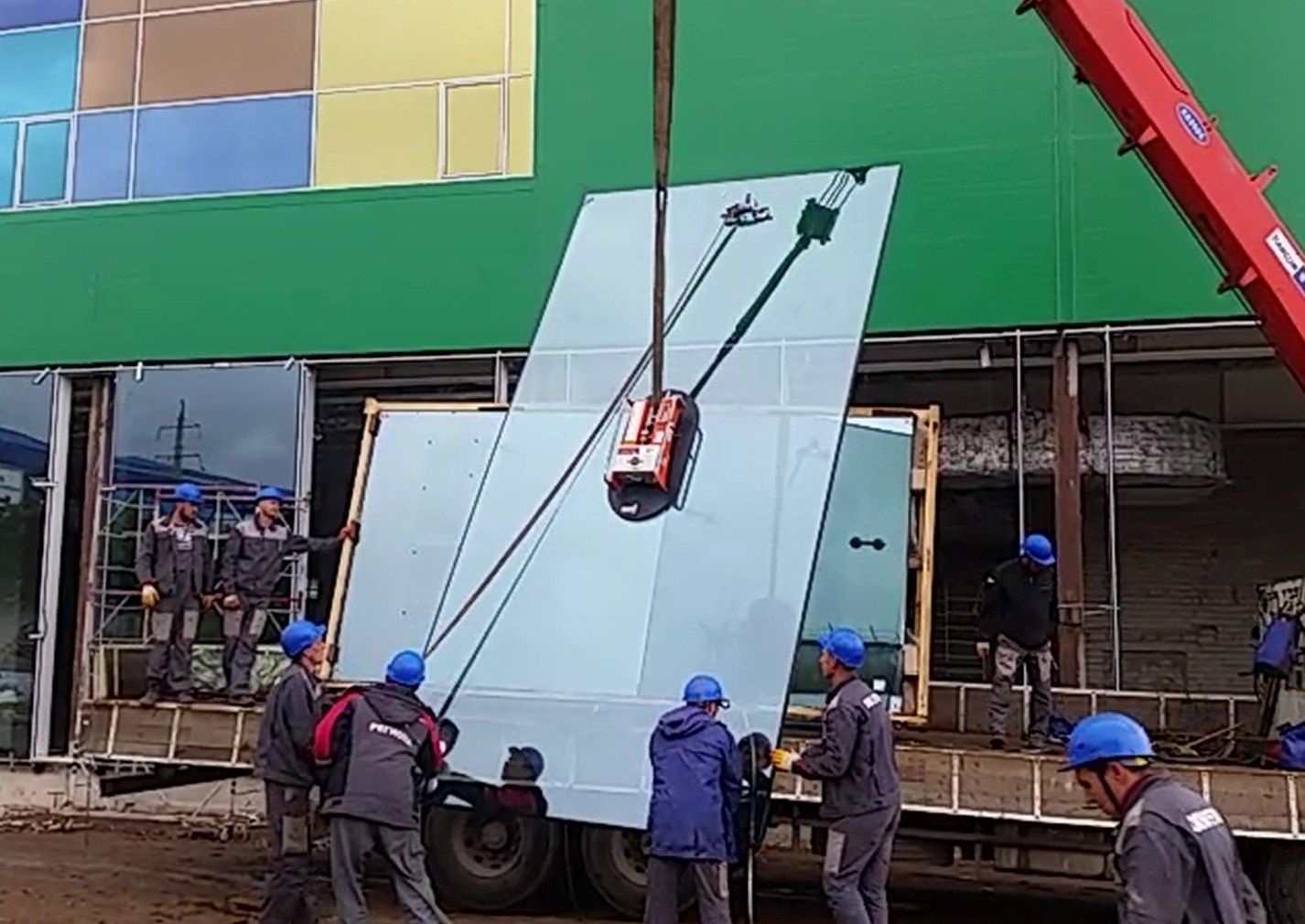 Остекление витрин магазина "Лето" вакуумным захватом ARLIFTER GS-850.