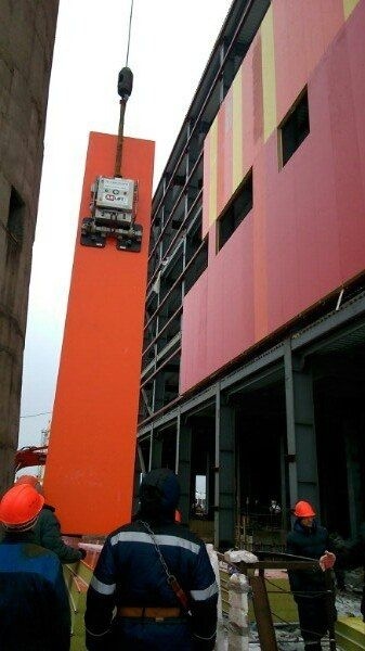 Вертикальный монтаж стеновых сэндвич-панелей 6м. с помощью вакуумного захвата ARLIFTER SP-3.