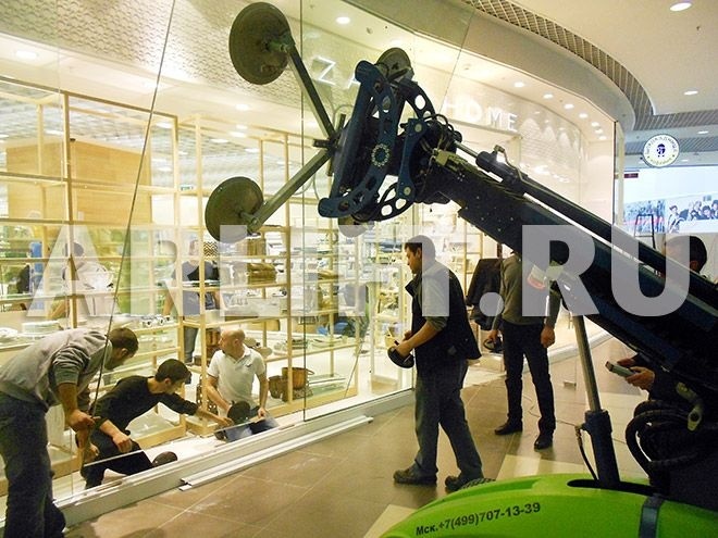 Остекление витрин магазина Zara Home в ТЦ Галерея (Новосибирск) с помощью стеклоробота Winlet 575.