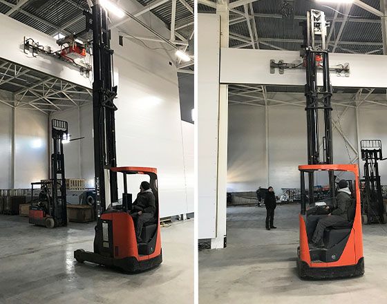 При строительстве промышленного комплекса в деревне Терволово Гатчинского района монтаж сэндвич-панелей выполнялся вакуумным захватом АРЛИФТ ARLIFTER SP-4 с использованием потолочной рамы и погрузчика.