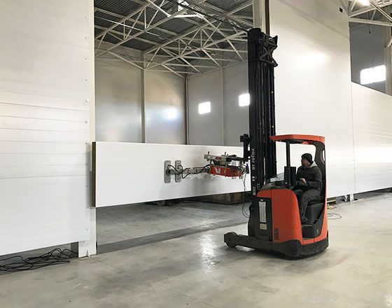 Монтаж сэндвич-панелей с помощью вакуумного захвата может производиться не только с помощью крана и лебедки, но и с помощью погрузчика.