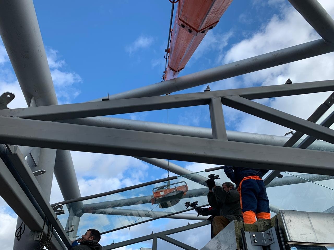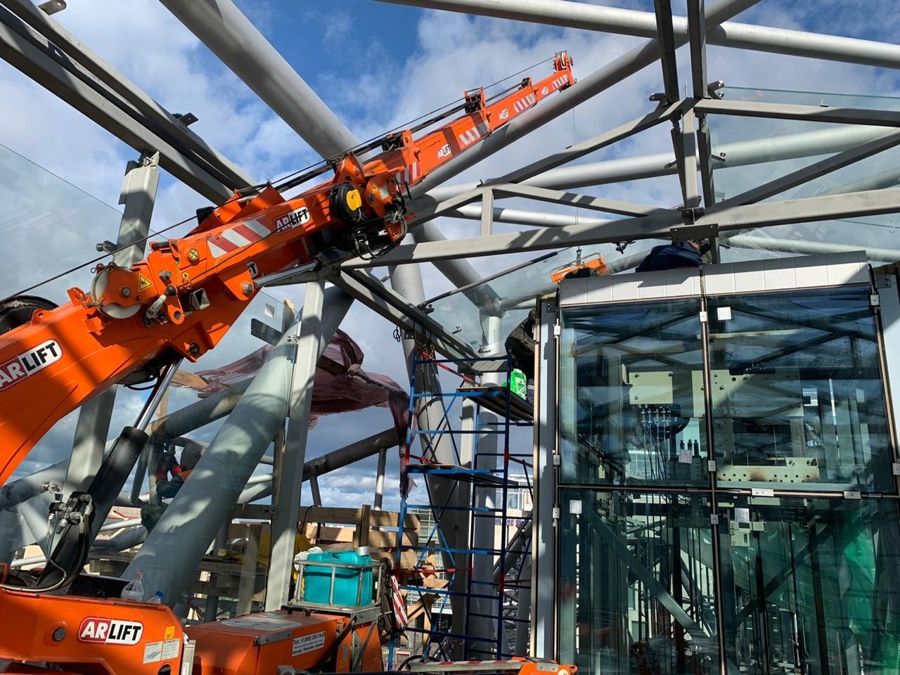 Для установки стеклопакетов на ограниченном пространстве предпочтение отдали малогабаритной спецтехнике Арлифт. В строительстве принимали участие мини-кран Арлифт SPD360CDH, мини-кран SPX527CDH, вакуумный захват линейки GS и стекломанипулятор MR800.4.