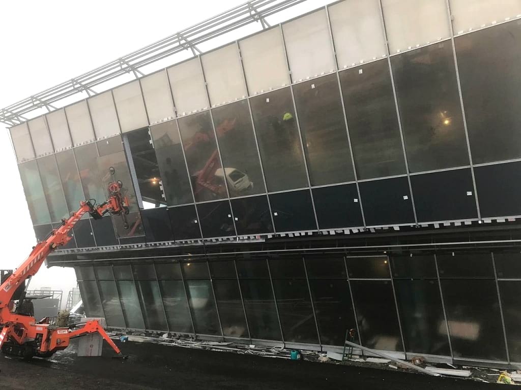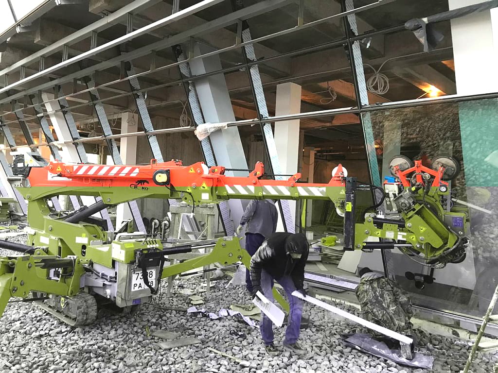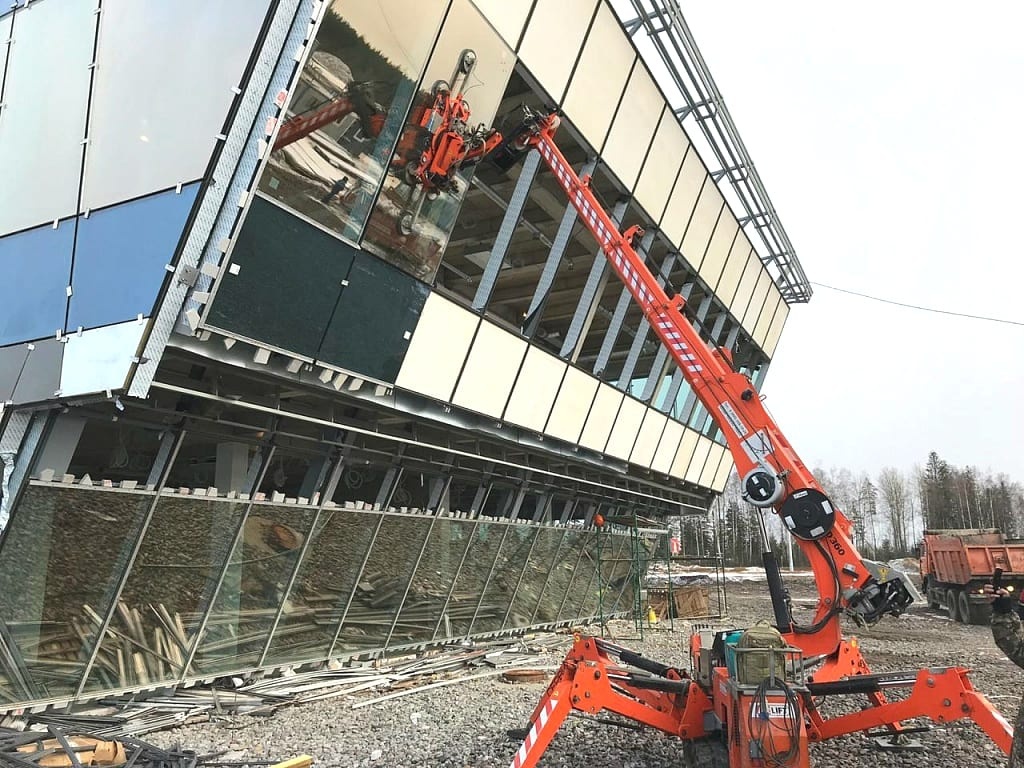 Нашей технике требовалось выполнить остекление центра с помощью стекла весом от 200 до 300 килограммов и размерами от 2х2 до 3х2 метров. Но главном условием было то, что стёкла требовалось монтировать под отрицательным углом. Для решения поставленной задачи было решено использовать мини-кран Jekko SPХ360CDH с манипулятором для стекла MR 800.4.