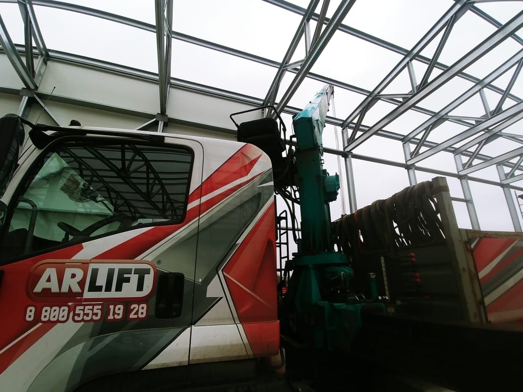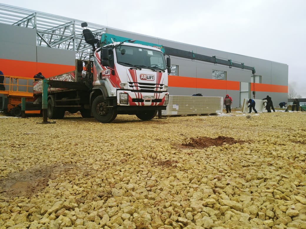Монтаж 6-метровых сэндвич-панелей для ангара осуществляли с помощью вакуумного оборудования – Arlifter GS-350, собственного производства компании, и крана-манипулятора Арлифт с максимальной грузоподъёмностью 7 тонн.