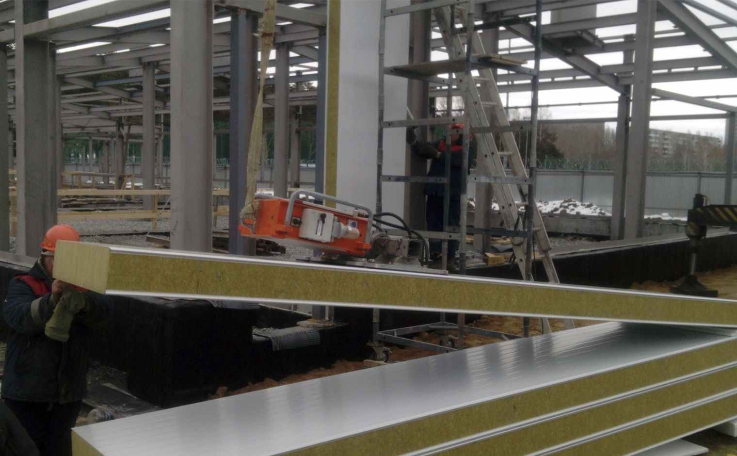 В рамках строительства Физкультурно-оздоровительного комплекса в городе Екатеринбург производился вертикальный монтаж стеновых сэндвич-панелей длиной 6 метров и толщиной 200 мм, весом 150-170 кг, с помощью вакуумного захвата ARLIFTER SP-4.
