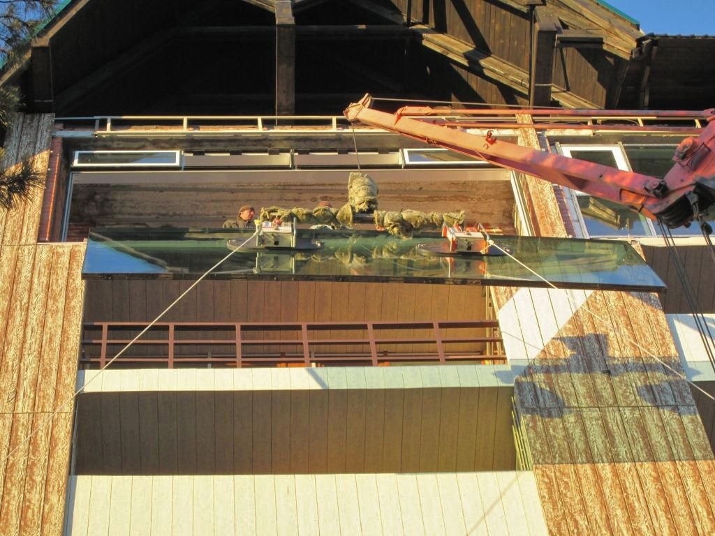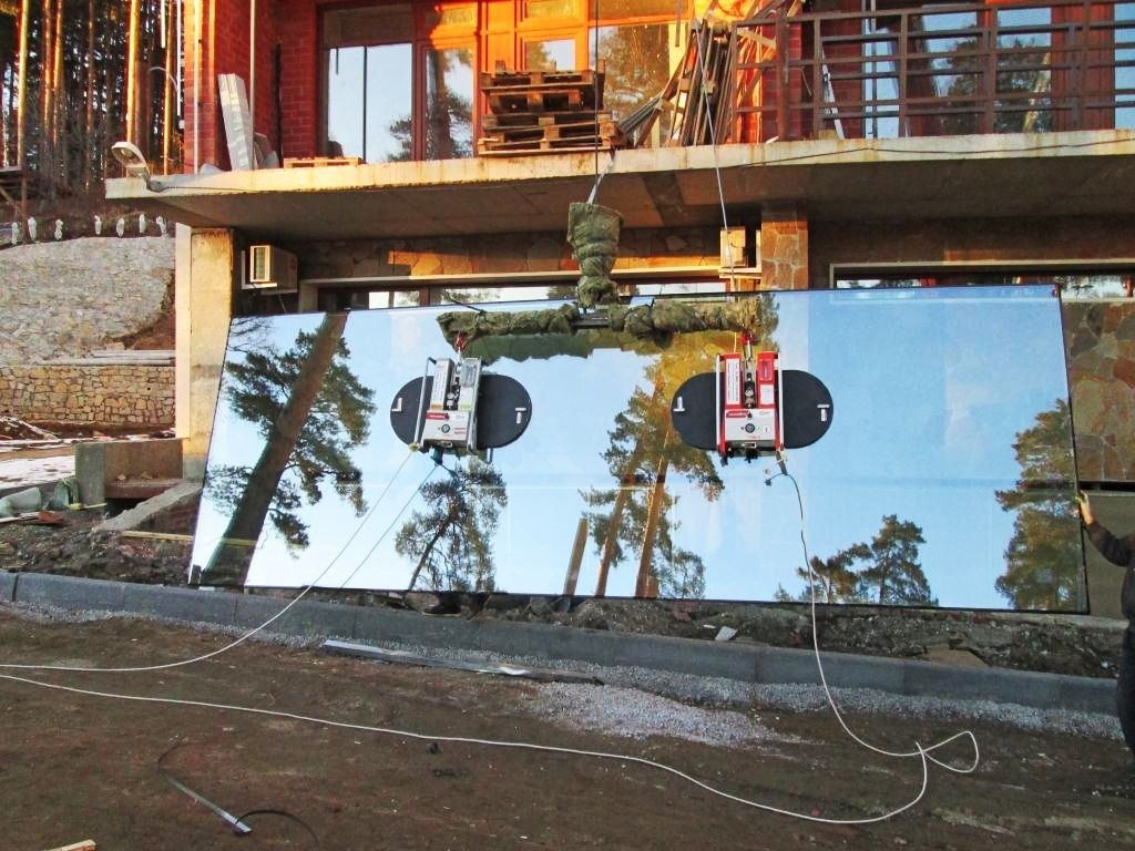Основной задачей было смонтировать стеклопакет размером 6х2 метра, весом 1190 кг. Для выполнения данного монтажа соорудили швеллер на который установили два вакуумных захвата ARLIFTER GS-850.