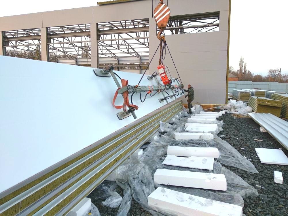 Реализация: В рамках строительства складского комплекса в Станице Мишкинская Ростовской области производился монтаж кровельных сэндвич-панелей длиной 13 метров и толщиной 200 мм, весом 460 килограммов с помощью вакуумного захвата ARLIFTER SPD-4.