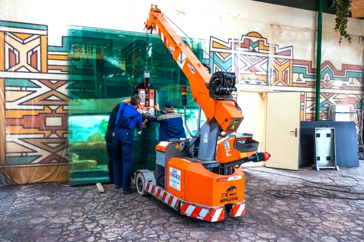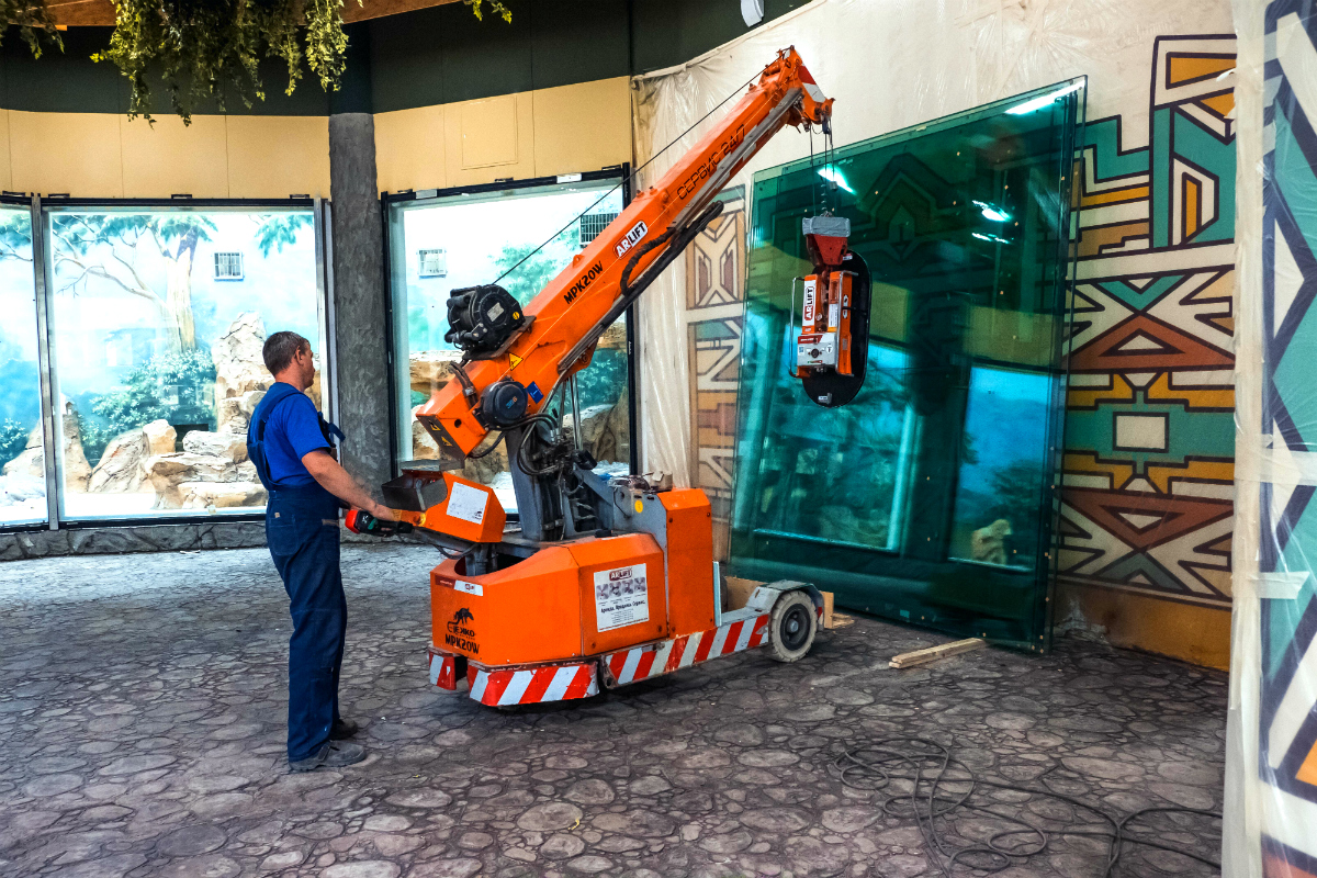 Строительство зоопарка в Казани. Монтаж стекла мини-краном Jekko MPK20