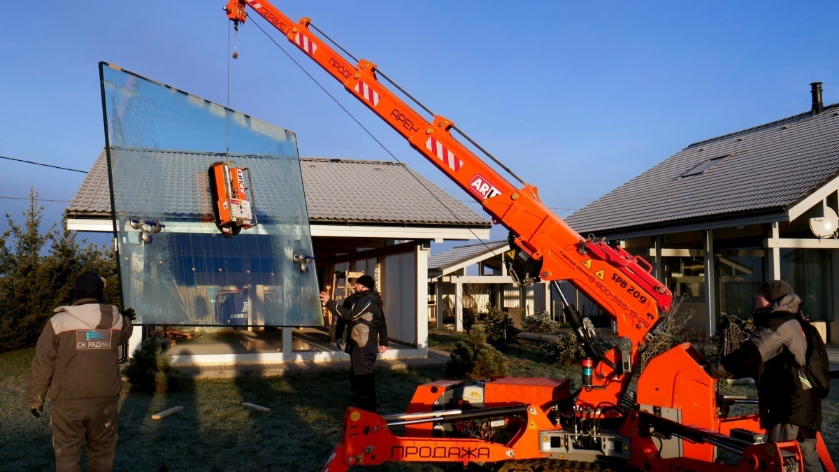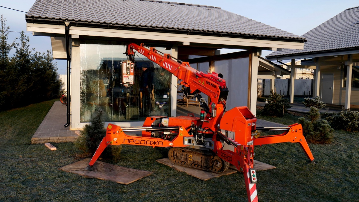Монтаж стекла в стесненных условиях мини-краном АРЛИФТ