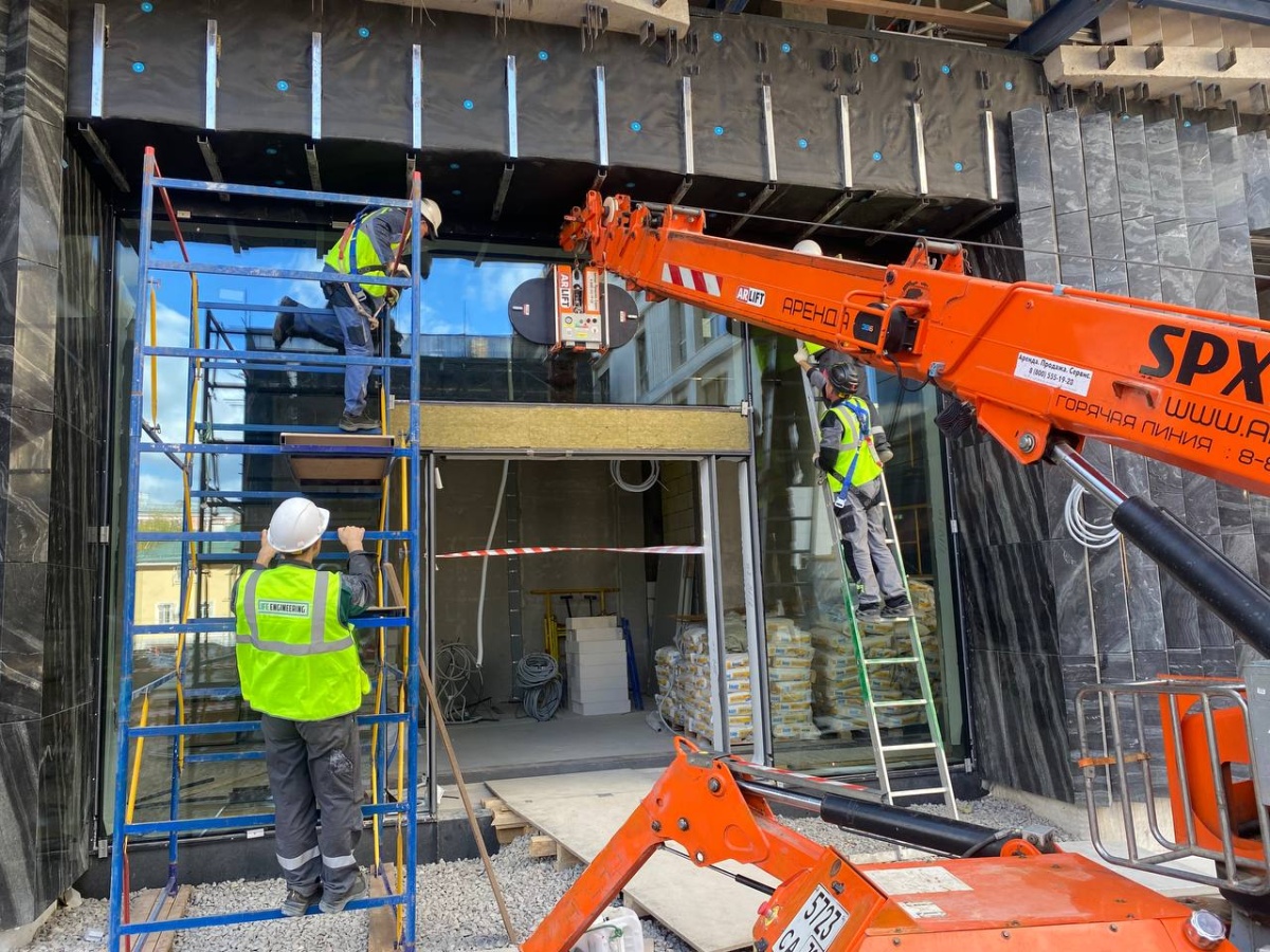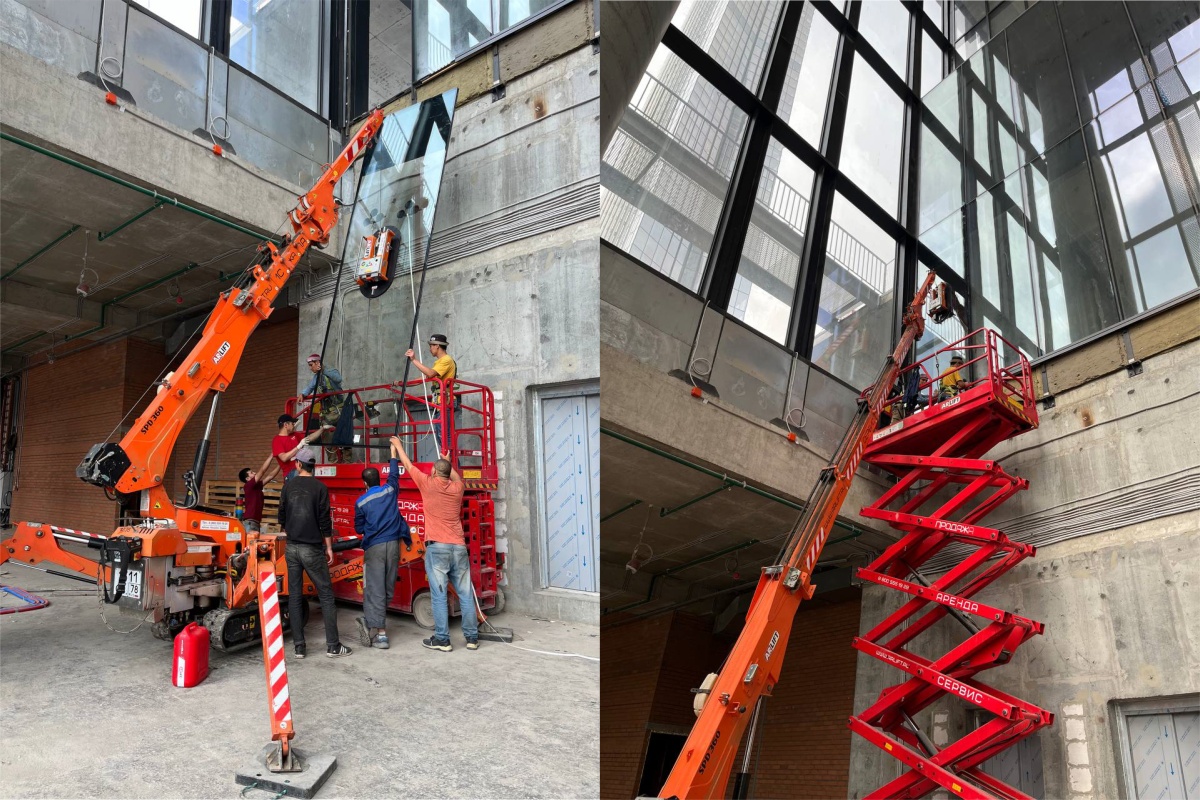 Остекление с помощью двух вакуумных захватов Арлифт и мини-крана