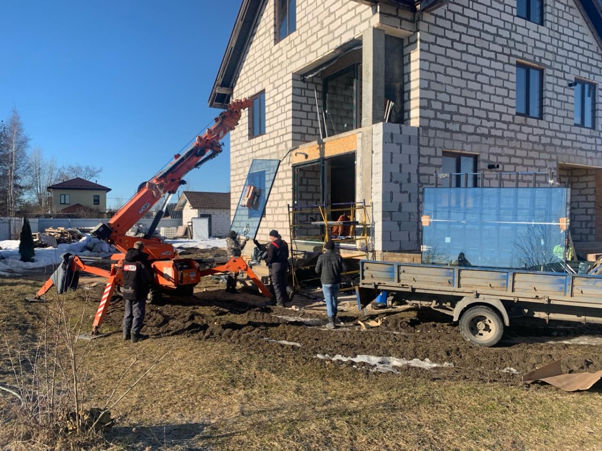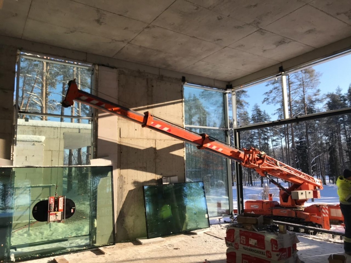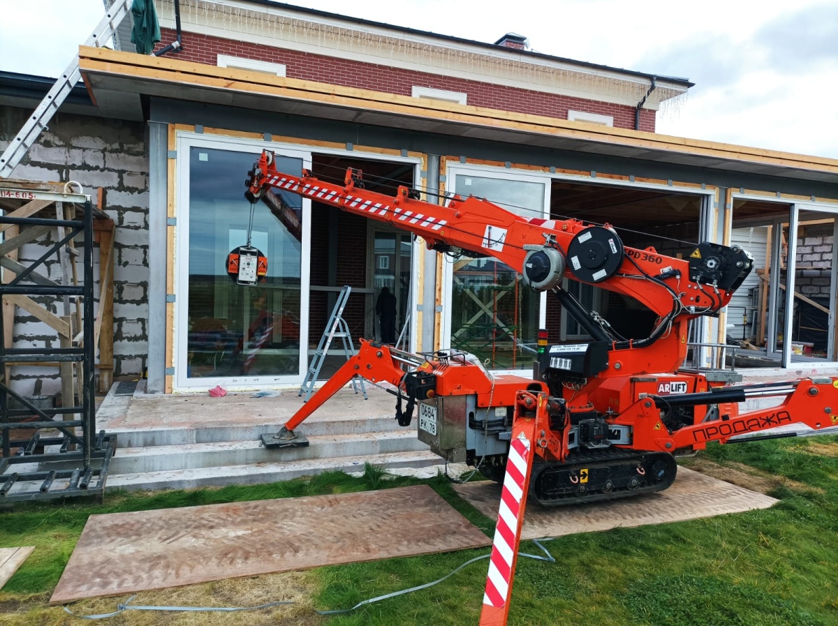 Мини-кран и вакуумный захват Арлифт на остеклении коттеджа в Ленобласти