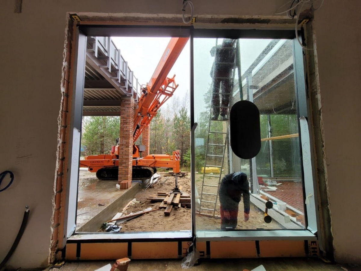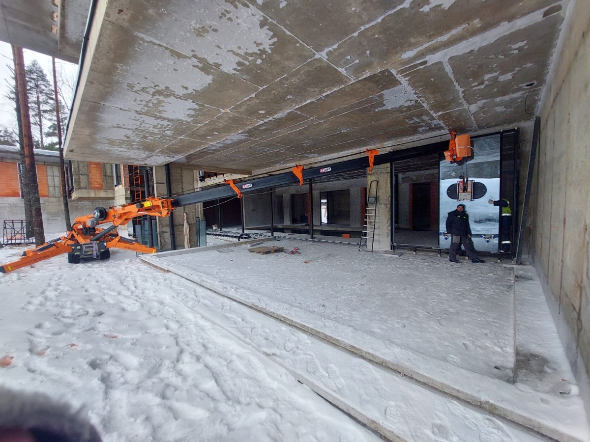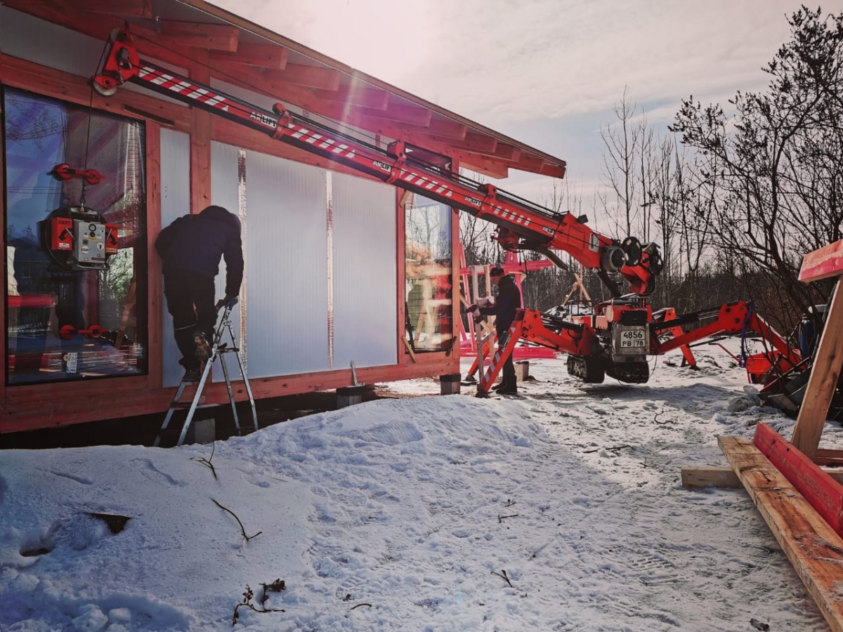 Мини-кран и вакуумный захват Арлифт на остеклении коттеджа в Ленобласти