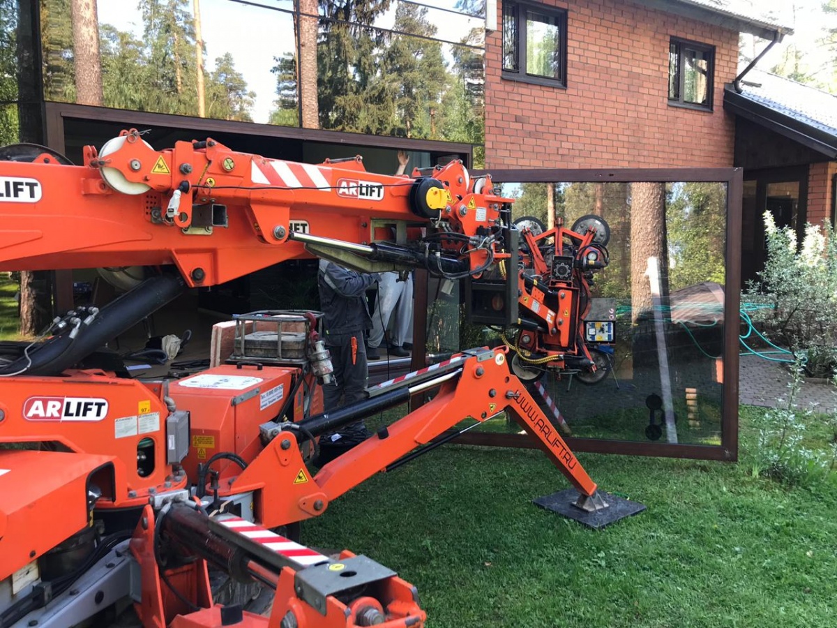 Монтаж стекла с помощью мини-крана и дополнительного оборудования MR800