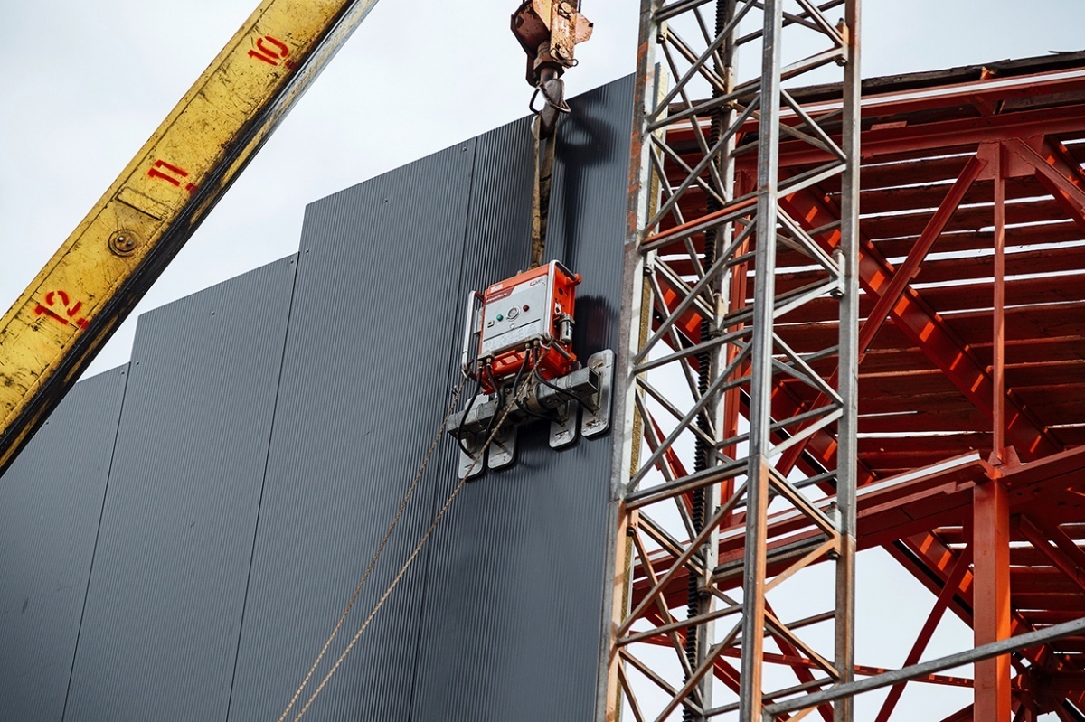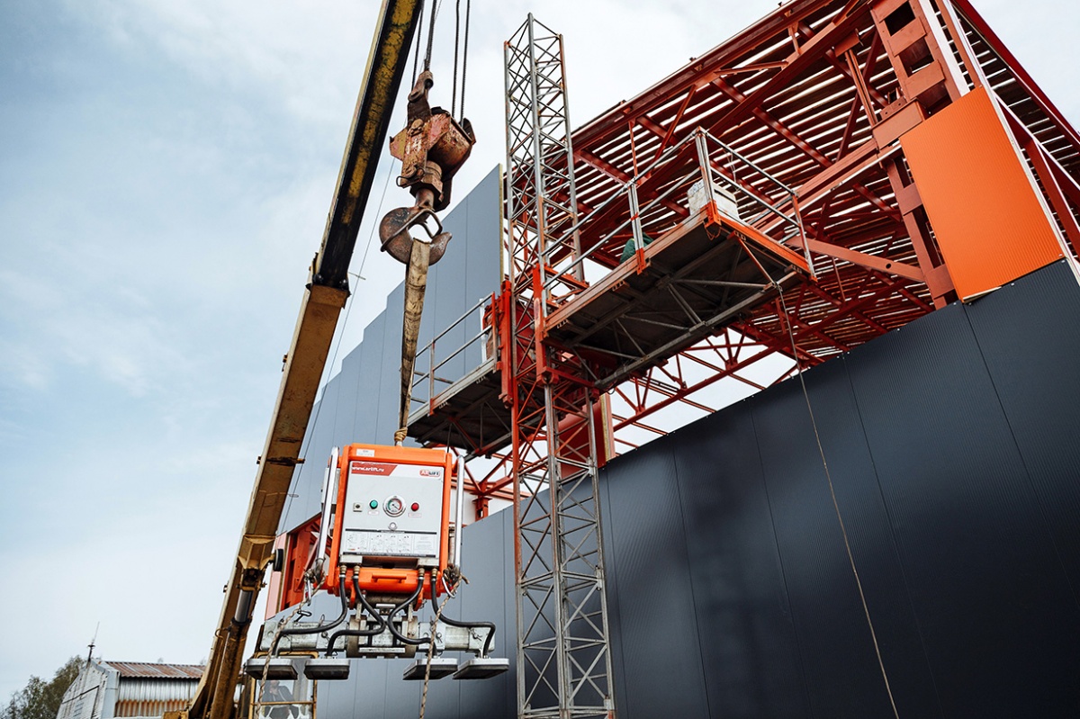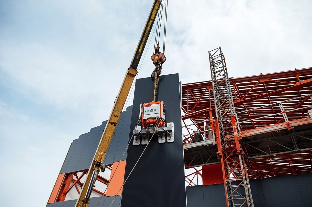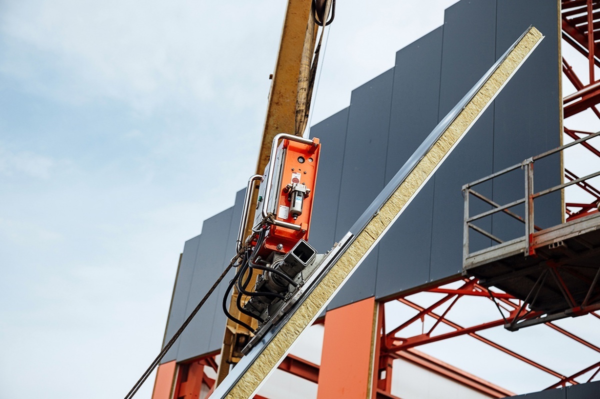 Вертикальный монтаж сэндвич-панелей вакуумным захватом