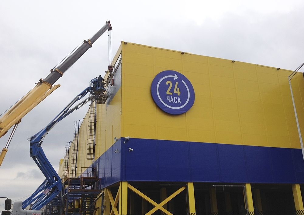 Облицовка фасада здания гипермаркета
