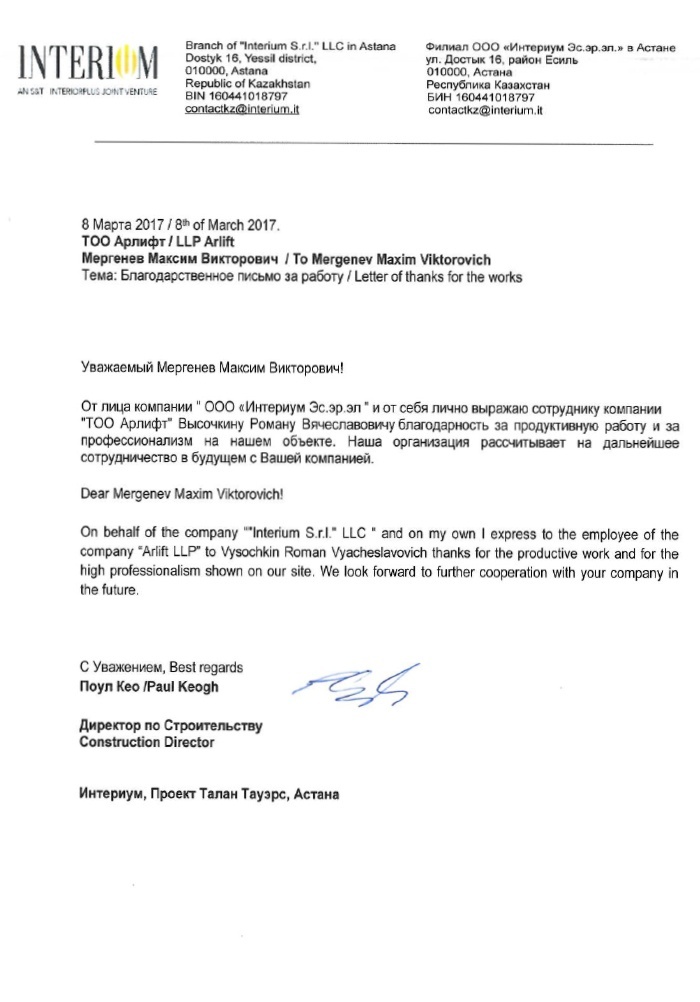 Отзыв от ООО "Интериум Эс.эр.эл."