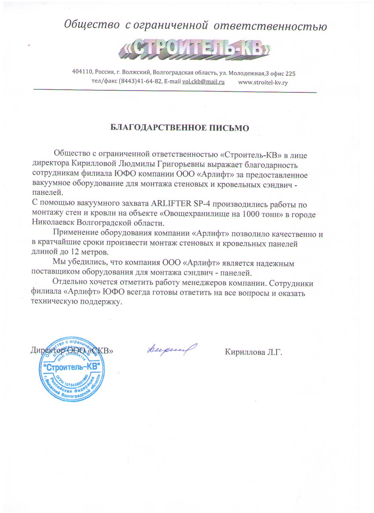 Отзыв от ООО "Строитель-КВ"