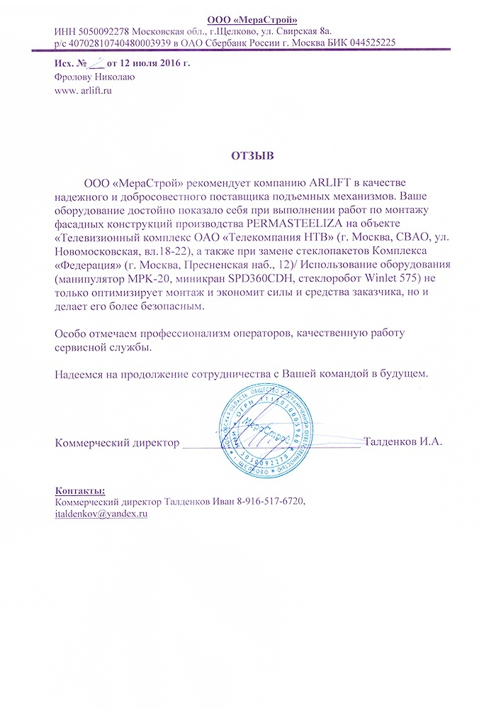 Отзыв от ООО "МераСтрой"