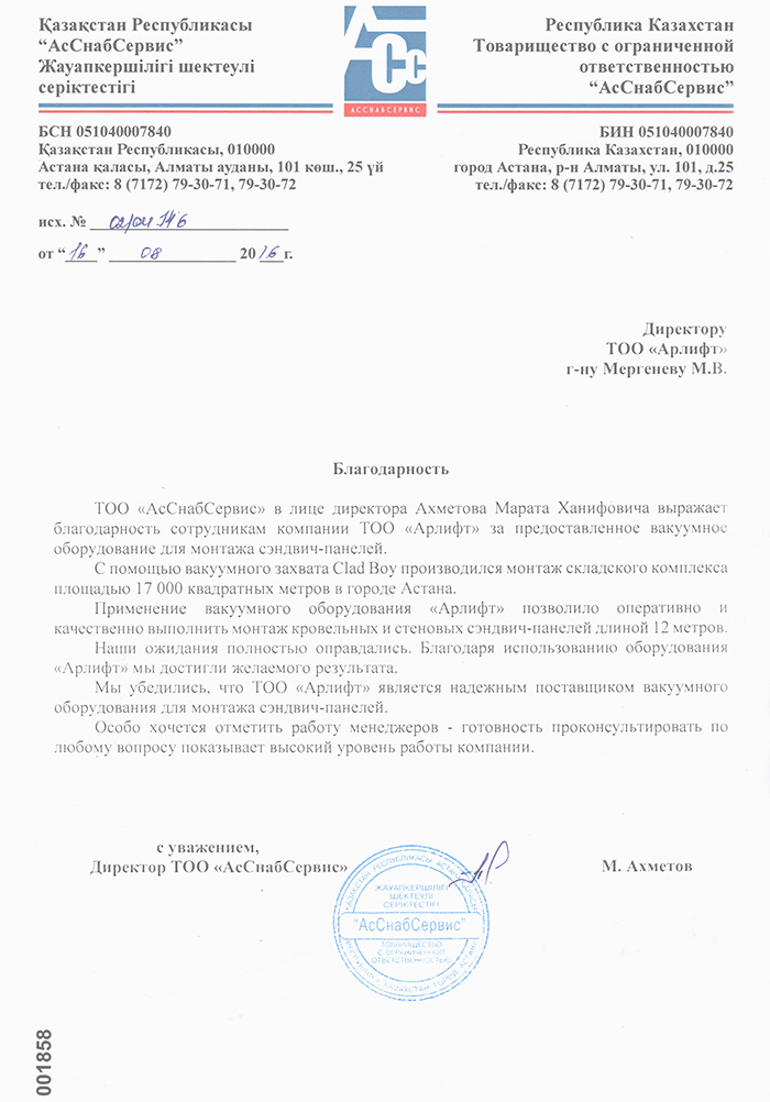 Отзыв от ТОО "АсСнабСервис"
